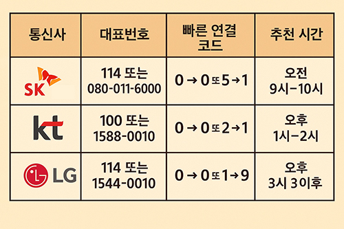 - 빠른 연결 팁: 114 → 0 → 0 → 상담사 연결 또는 114 → 5 → 1 → 상담사 연결 (요금 관련)